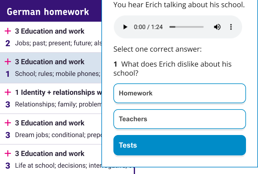 Aimed at Years 10 and 11, these topic tests contain Listening and Reading questions aligned to the new GCSE specifications.