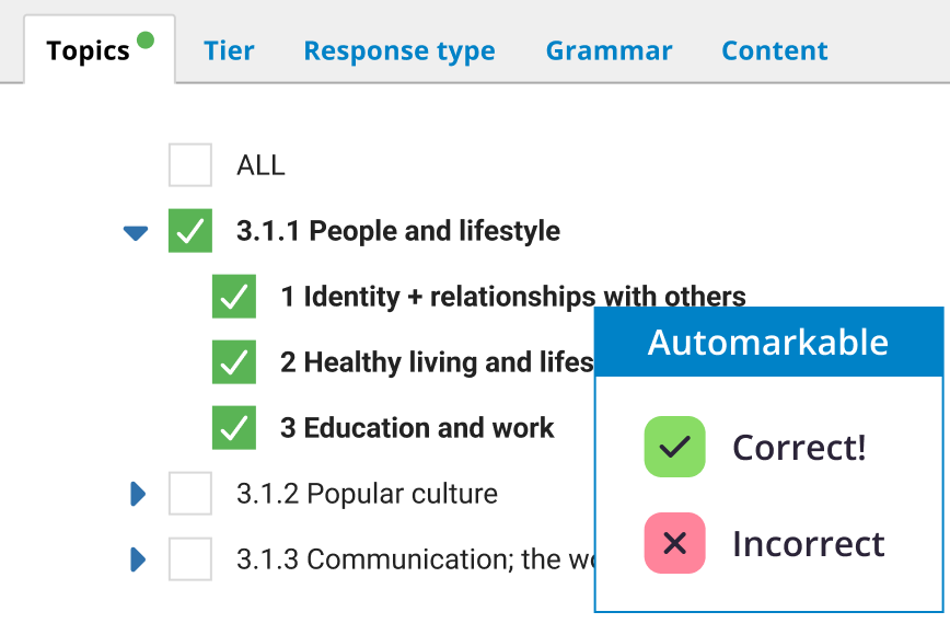 Work with students to identify strengths and weaknesses with questions covering a range of topics. Share questions, mark schemes, transcripts and self-assessment feedback forms to plan next steps for individuals and classes. Access all Languages topic tests with any Exampro Languages subscription.
